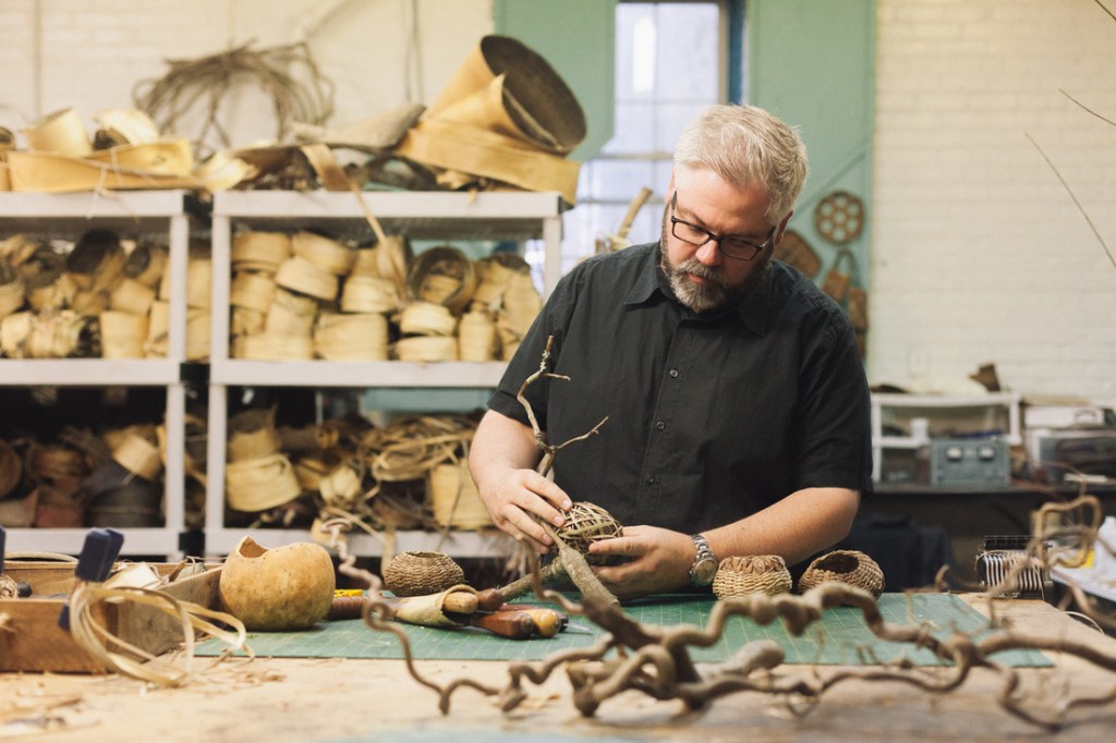The first time I toured Matt’s Asheville studio, I couldn’t take my eyes off the large pile of yard clippings lurking in the corner. To me, it appeared to be little more than a common brush pile — one you might find in the backyard after a Saturday afternoon of yard work. To Matt, however, this raw material that would soon give way to numerous artistic masterpieces.